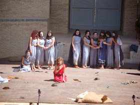 Primero pongo una foto del museo de Sagunto con vestuarios de Andrómaca (rojo), Hécuba (negro) y Polixena (blanco) y luego un par de momentos de la obra: